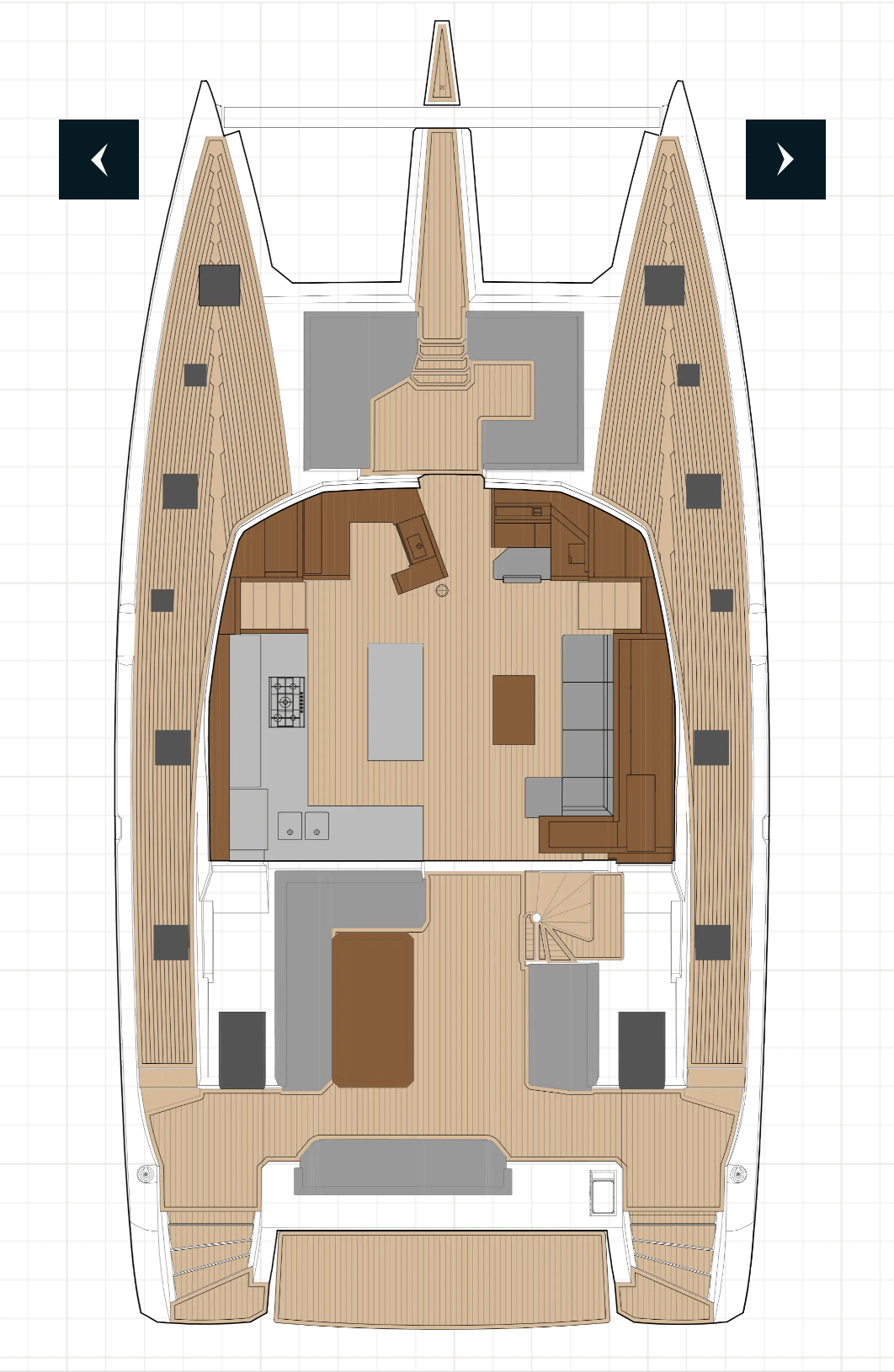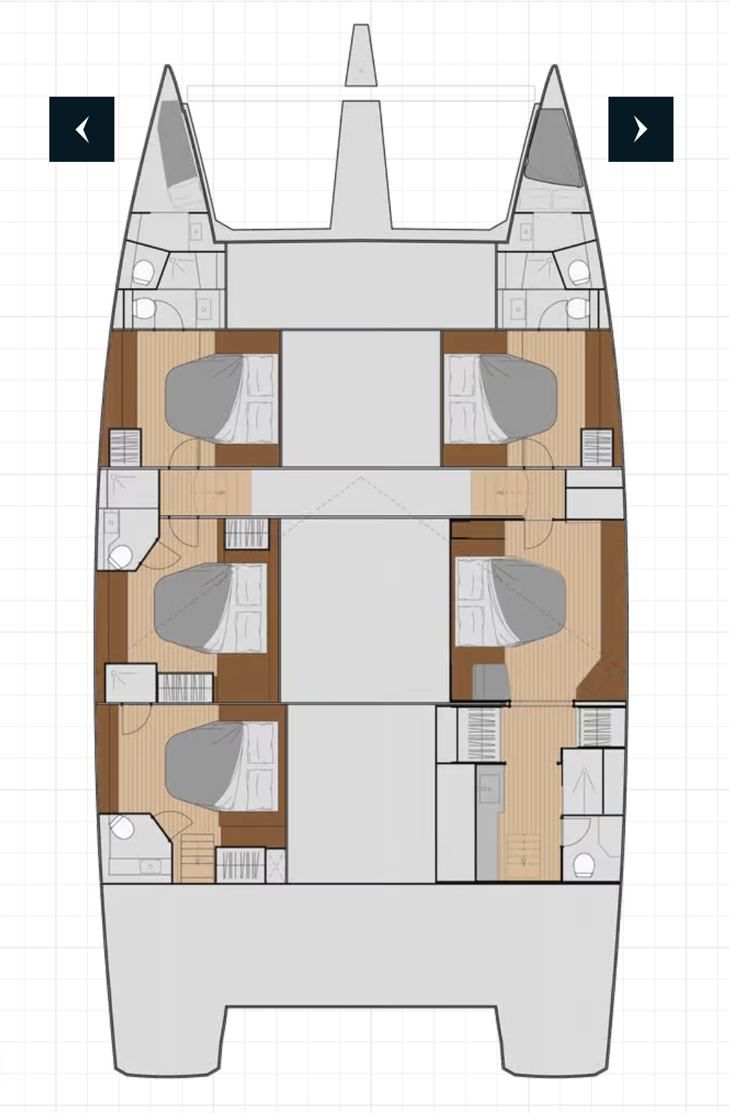 Le Catamaran peut accueillir 10 invités. L'équipage bénéficie de ses propres cabines dans les pointes avant aménagées.
