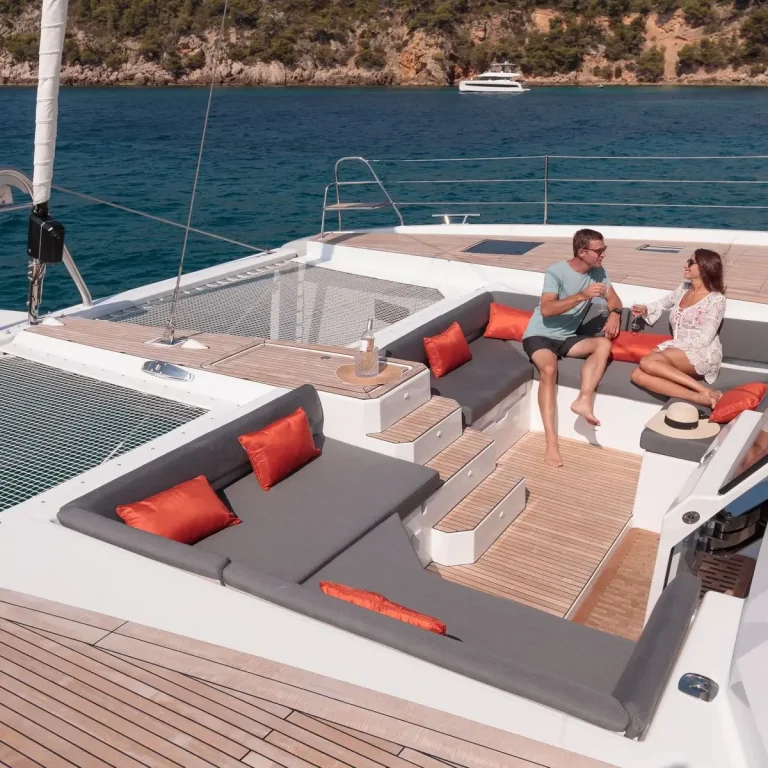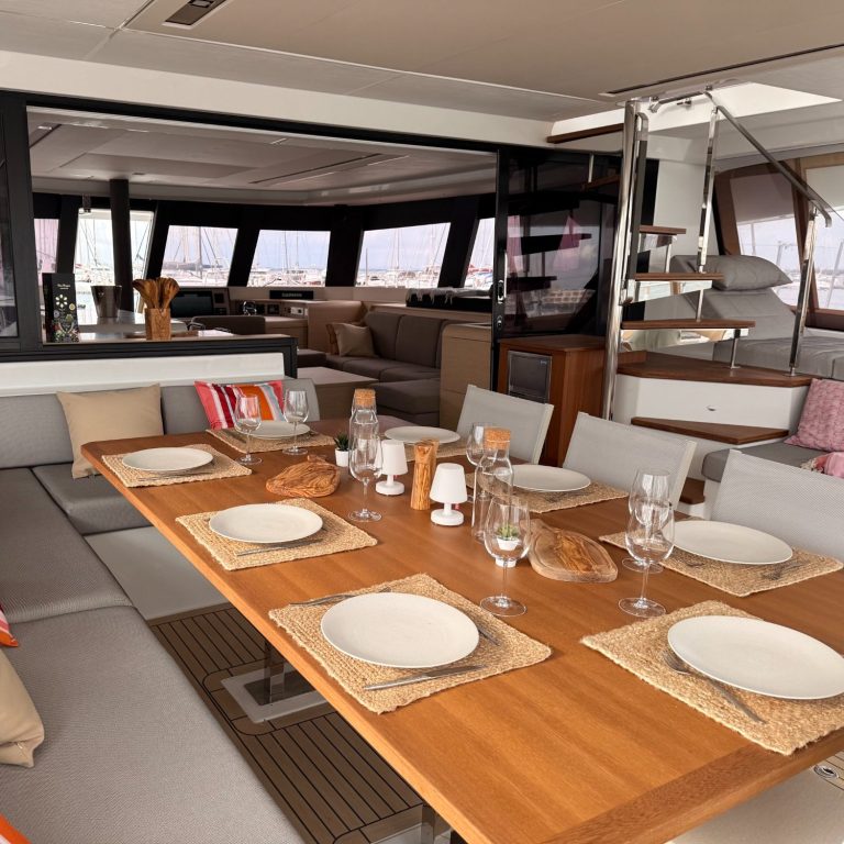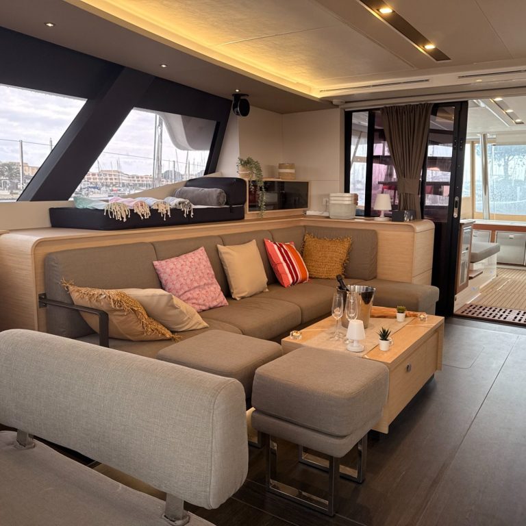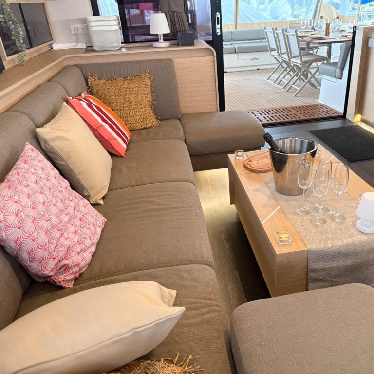 L’aménagement du bateau a quant à lui été pensé pour offrir de beaux espaces de convivialité et de relaxation. La répartition ingénieuse permet de partager de bons moments en famille ou avec des amis, tout en gardant des espaces d’intimité. Il est conçu pour recevoir 10 personnes de manière confortable en plus de l'équipage