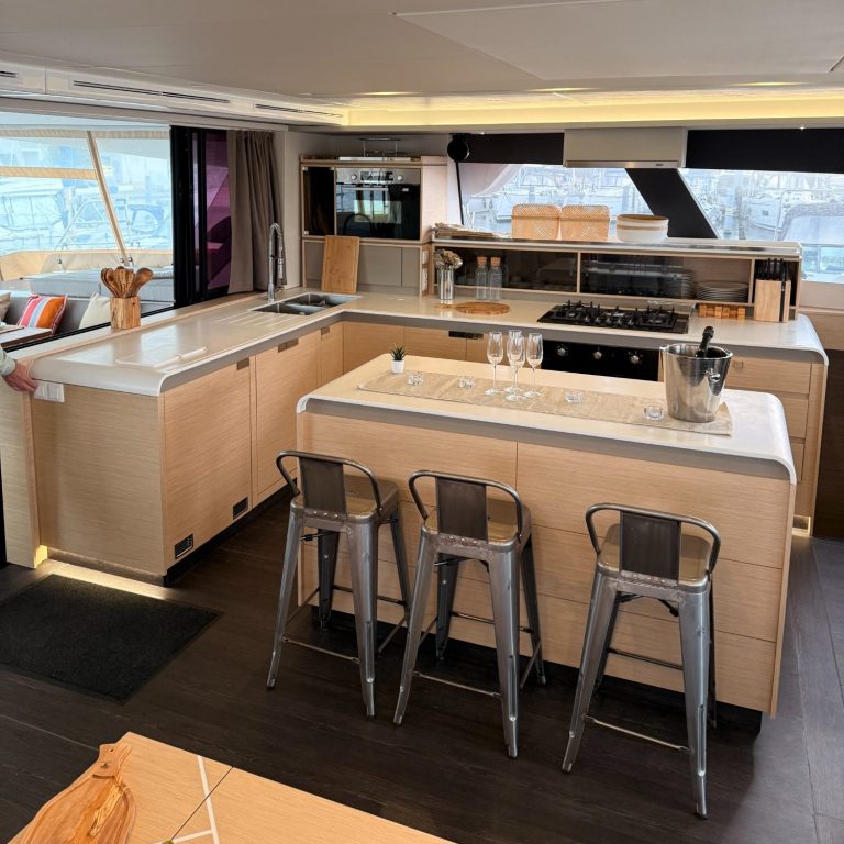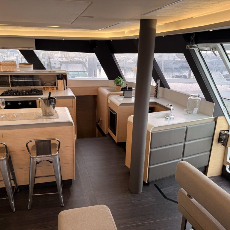 Grâce à un aménagement intelligent de l’espace, le vaste carré de 32m² propose une cuisine toute équipée avec ilot central, un bar, un espace canapé avec table basse, ainsi qu’un poste de navigation près de la porte vers le deck avant.