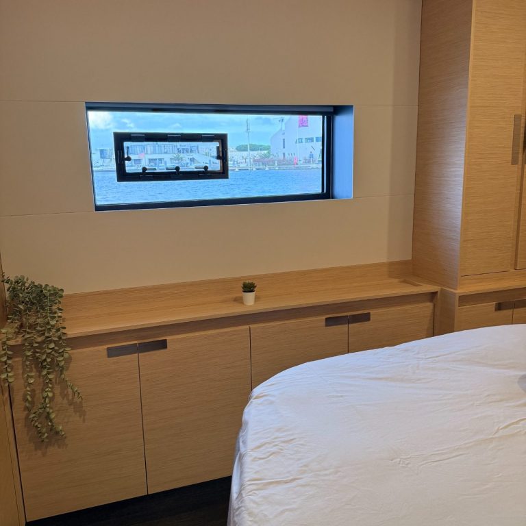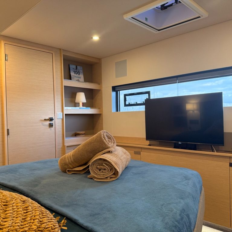 L’accès à la Master Bedroom est double : par le salon ou par le cockpit arrière. Elle dispose de sa télévision privative.