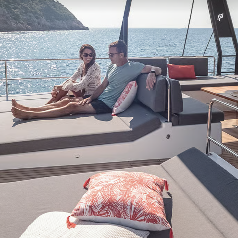 L'espace est agrémenté de deux trampolines ainsi que de deux Fatboy, qui sont de réels atouts sur ce catamaran.