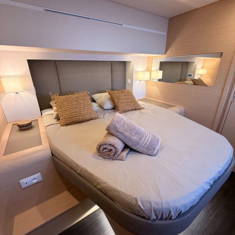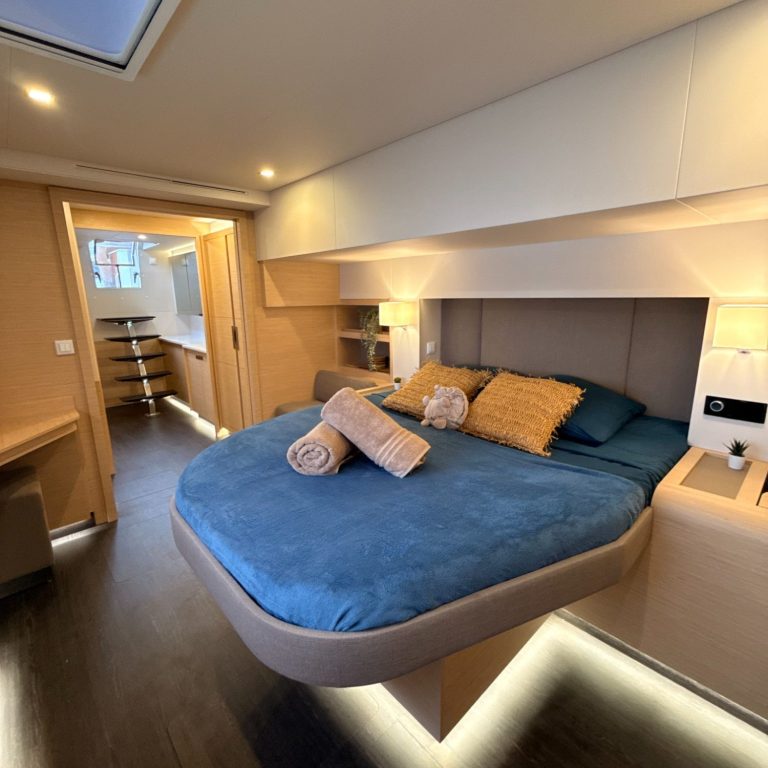 Le catamaran Bela-Vela offre 4 cabines invités très confortables ainsi qu'une master bedroom pouvant ainsi accueillir 10 invités. Toutes les cabines sont dotées de lits Queensize, des rangements généreux et une salle de bain privative.