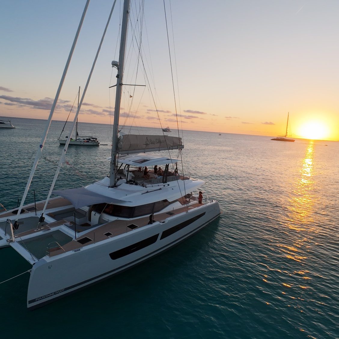 Lors d'une croisière en catamaran le flybridge est l'espace idéal pour profiter des magnifiques couchés de soleil.