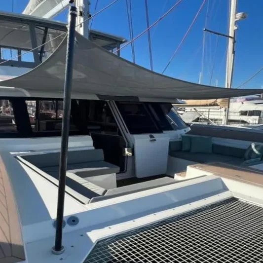 Le cockpit arrière du catamaran Bela-Vela s’étend sur une surface de près de 30m² autour d’une généreuse table à manger pour 10 à 12 convives. L'espace est équipé d’une plancha, de réfrigérateurs et d’une machine à glaçons : tout le confort pour des déjeuners réussis.